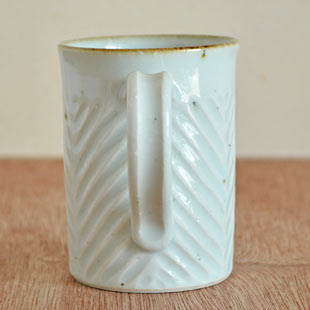 ![]() 筒型の縦に長い形が特徴のマグカップ。鉄分を混ぜた素地を使っているので、表面に大小の鉄点が表れて味わいがあります。中田太郎さんらしい手仕事の味わいを生かした“しのぎ”も魅力。 ![]() 高さは9cmくらい。通常のマグカップの形とは違ったお洒落さがあります。 素地を削って表現されたしのぎが、皐月窯さんらしいセンスで文様のようにデザインされています。 ![]() 持ち手の幅は1.5cmくらい。へこみがあるので手に馴染んで持ちやすい。 ![]() 縁の部分は「縁紅」とよばれる鉄色となっているので味わい深い印象。口径は約7mくらいです。 ![]() 底の直径は6.5cmくらい。 ![]() 皐月窯さんの「5」の窯印。 ![]() しのぎの入れた方や大きさなど、ひとつひとつ手づくりらしい違いがあります。 |