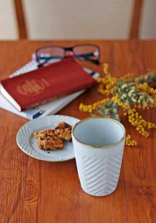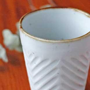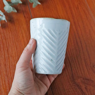 ![]() いろいろな飲み物に幅広く使えるカップ。 鉄分を混ぜた生地を使っているので、表面に大小の鉄点が表れて味わいがあります。手仕事の味わいを生かした“しのぎ”も魅力。 ![]() 高さは10cmくらい。 素地を削って表現されたしのぎが、皐月窯さんらしいセンスで文様のようにデザインされています。 ![]() 縁の部分は「縁紅」とよばれる鉄色となっているので味わい深い印象。口径は約7.8mくらいです。 ![]() 底の直径は5.5cmくらい。皐月窯さんの「5」の窯印。 ![]() しのぎの入れ方や大きさなどひとつひとつ手づくりらしい違いがあります。 ![]() これくらいの大きさ。 削りを入れたしのぎの部分が持ったときに、とても心地よく手に馴染みます。 |