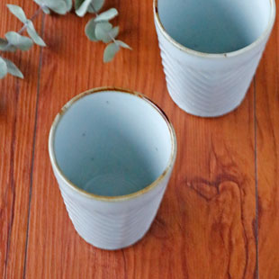 ![]() 普段使いのカップとして、日によってコーヒーを入れたり緑茶や紅茶を入れたり幅広い飲み物に♪ ![]() 麦茶やジュースなど、冷たい飲み物にも。小さめのビールグラスとしても素敵です。 ![]() 大小の鉄点が浮き出た荒土の素地。荒土のため縁の部分が若干つぶつぶとしている場合もあります。 うつわの表面はほんのりマット調の落ち着きある光沢。素朴な風合いに味わいあるしのぎがとてもよく似合います。 ![]() 重ねることも出来ます。直径が少しずつ違うため重なり方に個体差があります。 ![]() はがきと比べて。 |