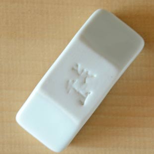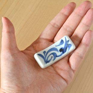 ![]() 安定感ある板状の使いやすい箸置き。 ![]() 両端が反っていて、お箸を置きやすい形となっています。 ![]() 横から見たところ。0.7cmくらいの厚みです。 ![]() 藍色の染付けが、白磁によく映えます。手描きらしい伸びやかなタッチ。 ![]() 裏には千山窯さんの「とべ 千山」の窯印。 ![]() 重なりがいいです。3個重ねると3.5cmくらいの高さ。 ![]() 2cm強×5.5cmくらいの大きさ。箸置きとしては定番のサイズです。 |