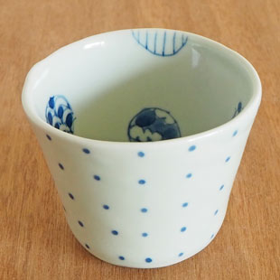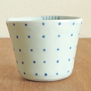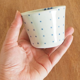 ![]() 手づくりらしい歪みあるかたちが特徴のぬくもりを感じるそばちょこ。 外側のシンプルなドットと、カップの中のキュートな和文様との組み合わせが楽しい。 万能のうつわといわれる「蕎麦猪口」は、カップとして小鉢としてと多用途にお使いいただけます。 ![]() ドットひとつひとつに手描きらしい味わいを感じる。 そばちょこの高さは6.5cm、深さは6cmくらい。板状の陶土を使ってつくられていますので継ぎ目のようになっている部分があります。 ほんのり青味掛かった白磁です。 ![]() 口径は8cmくらい。きれいな正円ではなくうねりあるかたち。 カップの中には手毬のような文様が描かれています。杉浦綾さんらしい大人っぽい可愛らしさの染付が素敵。深みあるカップのなかの絵付けは、とても繊細で手間のかかる手仕事です。 ![]() 底の直径は5cmくらい。 ![]() 底には「aya」の窯印。 ![]() 3個重ねると12cmくらいの高さになります。 ![]() これくらいの大きさの女性でも持ちやすいサイズ。そばちょことしては少し小さめとなります。 |