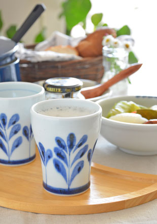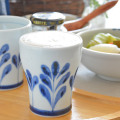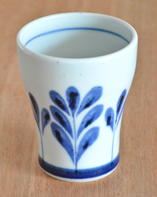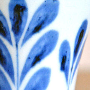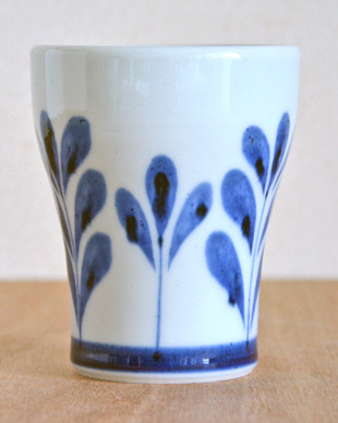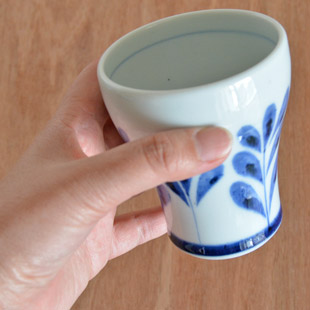![]() 直径8cm・高さ約9.5cmのフリーカップ。トロフィーを思わせるような持ちやすい形が特徴。 ![]() 陶房遊さんの新作『ブルーリーフ』は木の葉をモチーフにお洒落にデザインされた絵柄です。 ![]() フチの近くには、藍色のラインが引かれています。 ![]() 底の直径は5.5cmくらい。 ![]() 底には陶房遊さんの「とべ 遊」の窯印。 ![]() 大きさ・形、絵付けの濃さや色合いなどひとつひとつ手づくりらしい違いがあります。 ![]() 飲み口よりも手に持つ部分の直径が小さめなので持ちやすいかたち。砥部焼らしくほどよい重みがあります。 |
