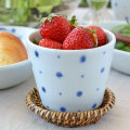 ![]() 小鉢として冷奴を盛っても素敵♪ そばちょこは万能の器といわれるように、小鉢として使用したりカップとしたりデザートカップとして使ったりと、ひとつで何役もこなしてくれます。 ![]() デザートカップとして、あんみつやアイスクリームやヨーグルトなどにも♪ 写真奥のそばちょこは「レッドプラネットのそばちょこ」。色違いのペアで揃えても。 ![]() 爽やかな絵柄だから、フルーツもよく似合います。 ![]() 重なりもいいです♪2個重ねると9.5cmくらい、3個重ねると11.5cmくらいの高さ。 ![]() 砥部焼らしく厚みのあるそばちょこですので、カップとして使ってもなめらかな口あたり。 ![]() 手描きらしいにじみや藍色の濃淡。シンプルな絵柄ですがあたたかみを感じるのは、手描きだからこそ。 ![]() 絵付けの濃さや色合いなどひとつひとつ手づくりらしい違いがあります。 |