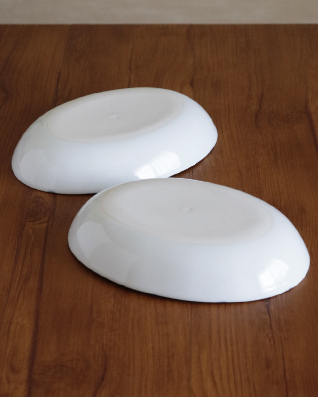 ![]() 雲石窯さんらしいあたたかみある染付が素敵な深みある楕円皿。砥部焼らしく厚手のなめらかな白磁ですので毎日の食卓で気兼ねなく愛用できます。 ![]() 高さは3.5cmくらい。深さは3cmくらい。 少し深さがありますので少々汁気のある料理の取皿としても活躍します。 ![]() なめらかな白磁によく映える染付。 手描きらしいやさしい雰囲気に心なごみます。 ![]() 底の部分は14cm×9cmくらい。高台がない平らなかたちのつくりです。 ![]() 大きさや藍色の濃さなど手仕事らしいの違いがあります。手づくりならではの味わい。 ![]() 丸みあるシルエットがやさしい雰囲気。 ![]() 2枚重ねると5cmくらいの高さです。 ![]() カレー皿は全部で5柄ございます。 |