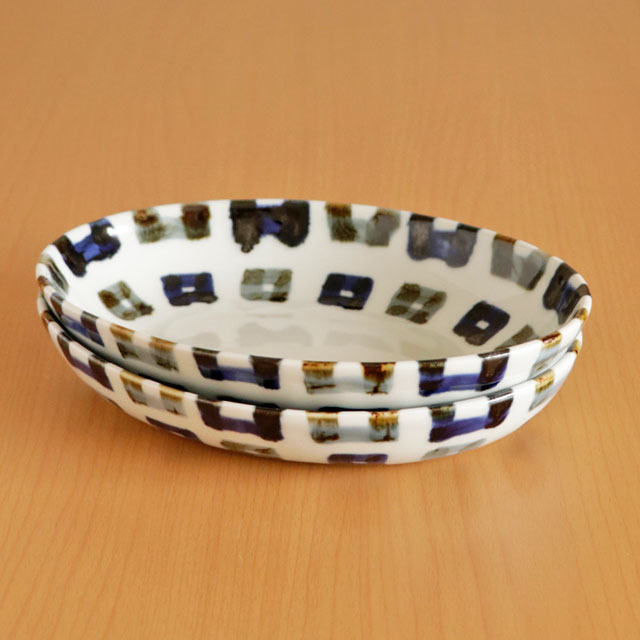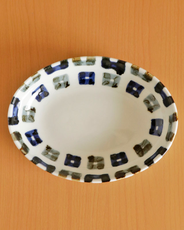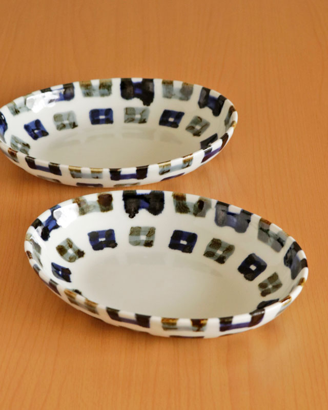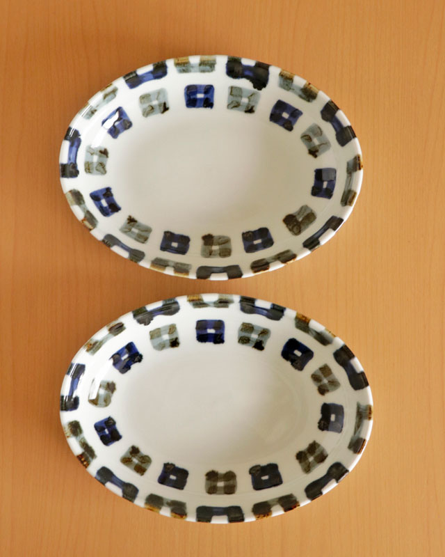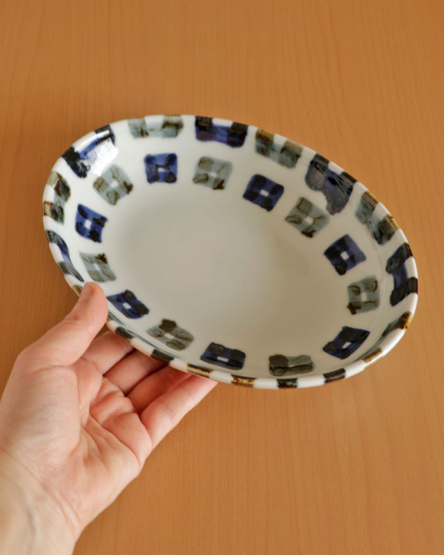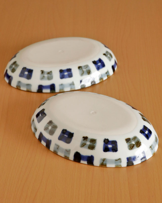![]() 雲石窯さんらしいあたたかみある染付が素敵な深みある楕円皿。砥部焼らしく厚手のなめらかな白磁ですので毎日の食卓で気兼ねなく愛用できます。 四角文様が縁部分で折り返してある描き方が素敵です♪ ![]() 高さは3.5cmくらい。深さは3cmくらい。 少し深さがありますので少々汁気のある料理の取皿としても活躍します。 ![]() 手描きらしい四角の文様。藍色と鉄色と交互に描かれています。 手描きらしいぬくもりを感じる絵付けに心なごみます。 ![]() 底の部分は14cm×9cmくらい。高台がない平らなかたちのつくりです。 裏側にも文様が描かれています。 ![]() 大きさや藍色の濃さなど手仕事らしいの違いがあります。手づくりならではの味わい。 ![]() 丸みあるシルエットがやさしい雰囲気。 ![]() 2枚重ねると5cmくらいの高さです。 ![]() その他にも5柄ございます。絵柄違いで揃てても♪ |