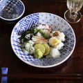 ![]() 直径18cmくらいの丸皿。料理が美しく映える繊細な絵付けが魅力的。 シンプルな1人分のメイン料理のうつわとして毎日活躍するサイズの使いやすい器です。 ![]() 器の高さは4cmくらい。器の深さは3cmくらいとなります。 ![]() 数種類の連続した幾何学的な文様を細やかに描きこんだ祥瑞(しょんずい)と言われる絵付け。和食器のなかでも最高級といえる格を持つ文様です。 田中貴美子さんの熟練された筆使いを堪能できる絵付け。 ![]() 田中貴美子さんの「貴」の文字。高台の直径は9.5cmくらいです。 ![]() 裏側には藍色の幅広の藍色のラインが引かれています。ほどよい深みある丸皿です。 ![]() 絵付けの濃さや筆使いなど手づくりらしい違いがあります。 ひとつひとつに個性を感じます。 ![]() 直径や高さなども1枚1枚手仕事らしい違いがあります。 | ![]() お刺身を美しく引き立てて特別なひとしなに。 ![]() 1人分のソテーや炒め物にも活躍。この器に盛るだけでご馳走に♪普段の料理を素敵に演出してくれます。 ![]() フルーツを盛っても素敵です。 ![]() 細やかでありながらも手描きならではの奥深さがあります。 ![]() 3枚重ねると6cmくらいの高さ。手づくりのため、直径や高さなどに若干の違いがございます。 ![]() これくらいの大きさ。砥部焼らしい重みがあります。 ![]() はがきと比べて。 |